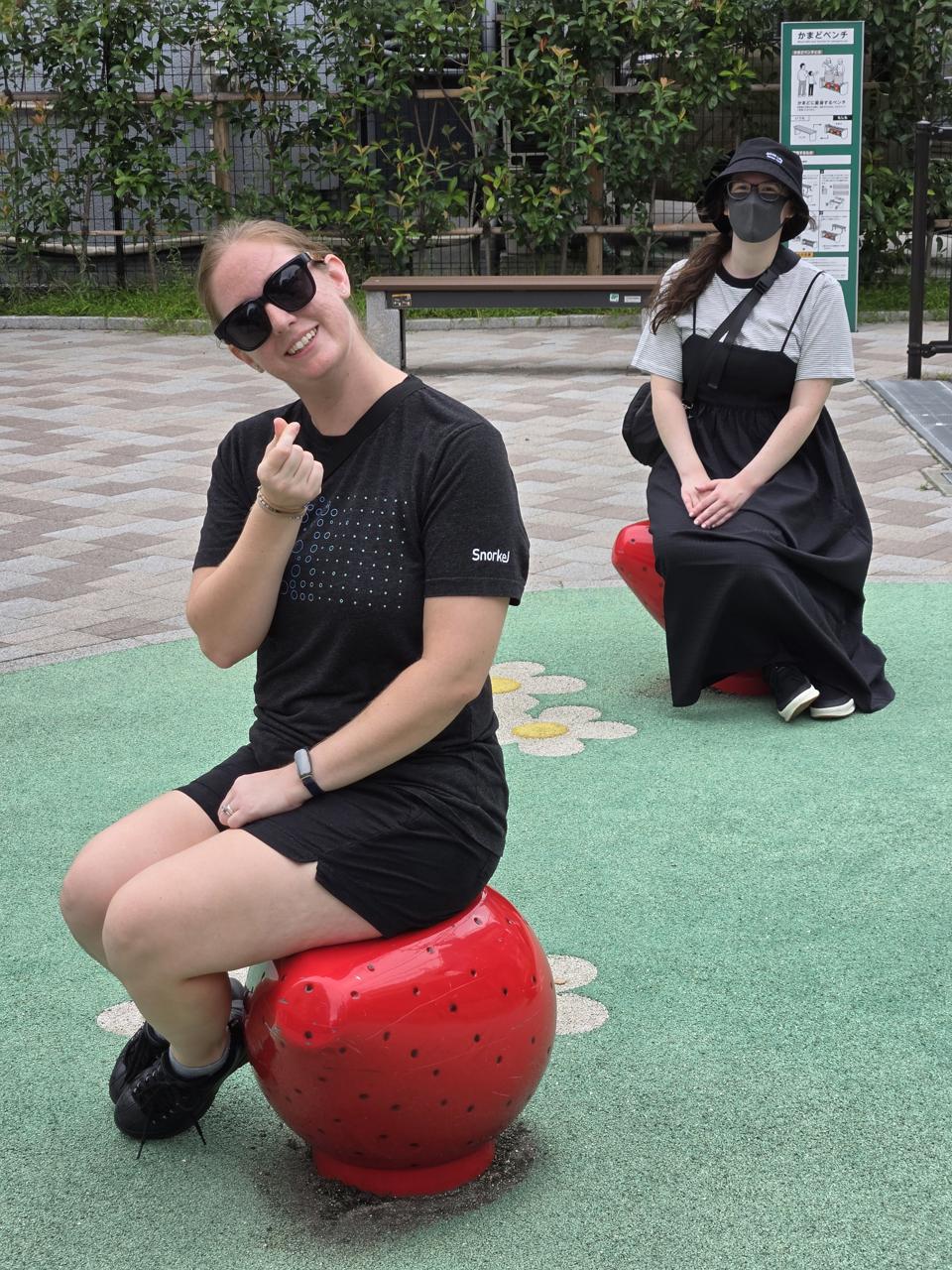 Cassie and Shaz in a cute little park we found. Fun fact - this park also doubles as an emergency shelter; every bench is also either a grill, toilet, or supply storage!